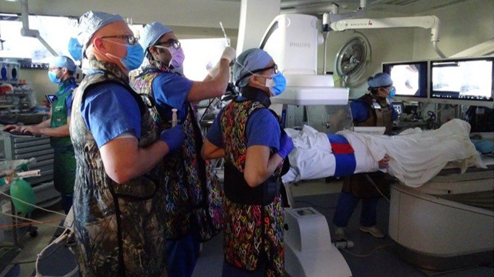 Interventional Pulmonology team performing a cone-beam CT-guidedbronchoscopic lung biopsy with Dwayne Free, senior respiratory therapist (left) and Harmeet Bedi, MD (center).