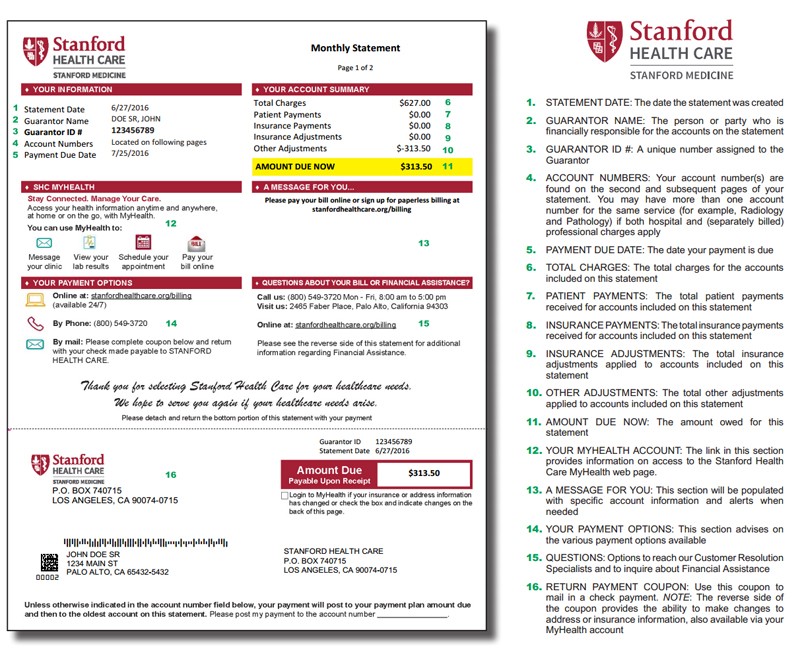 The Stanford Health Care monthly billing statement shows activity and balances due for hospital and professional services where a patient liability has been incurred, and the date the services were provided.